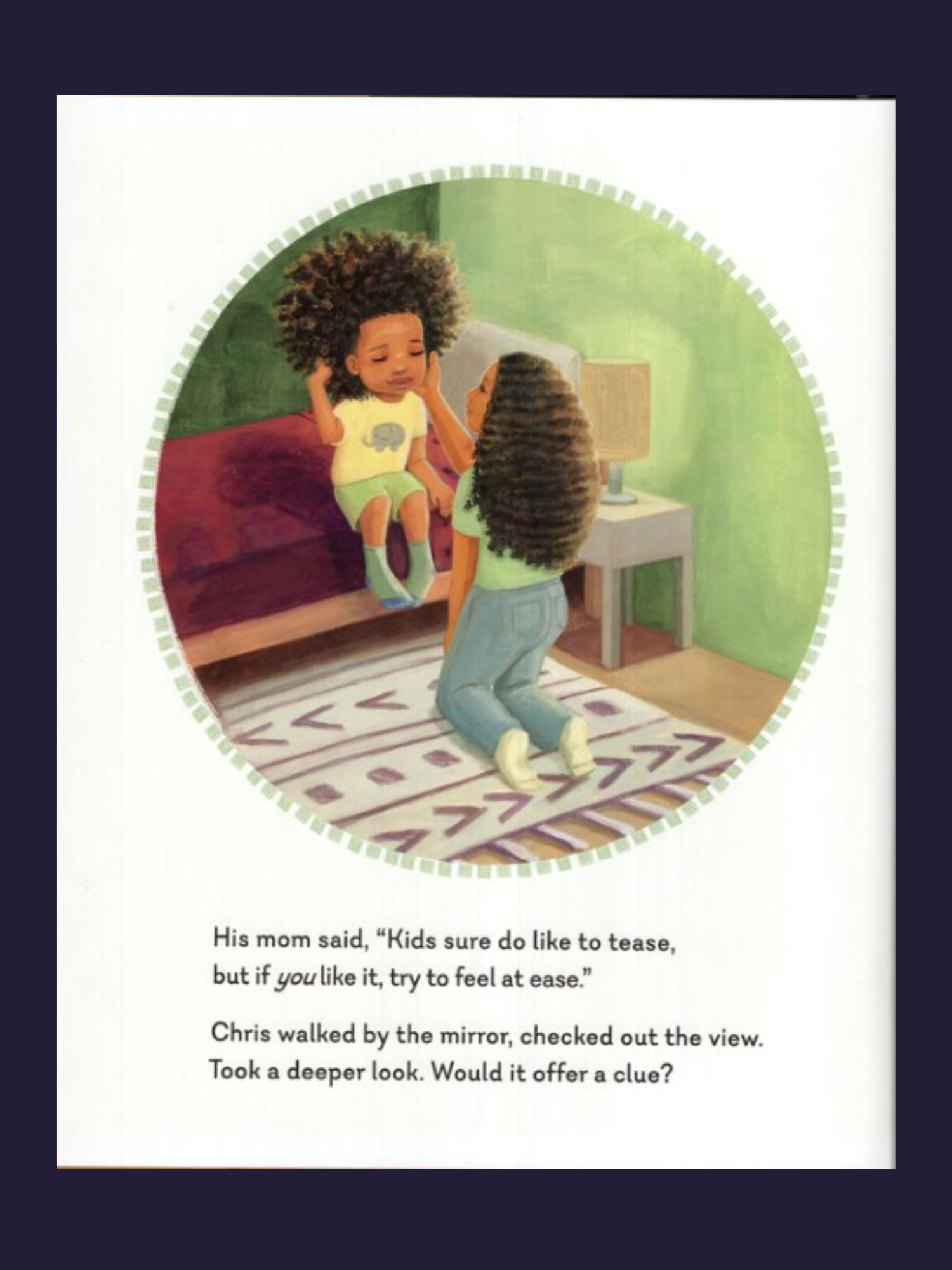 Chris loves his long, curly hair, so why do his classmates tease him about it? When he looks for answers in this mirror, something wonderfully wild and weird happens: a lady appears with wise words that make him feel like a king! But when he starts acting like a king at school, it's time for another visit to the mirror.