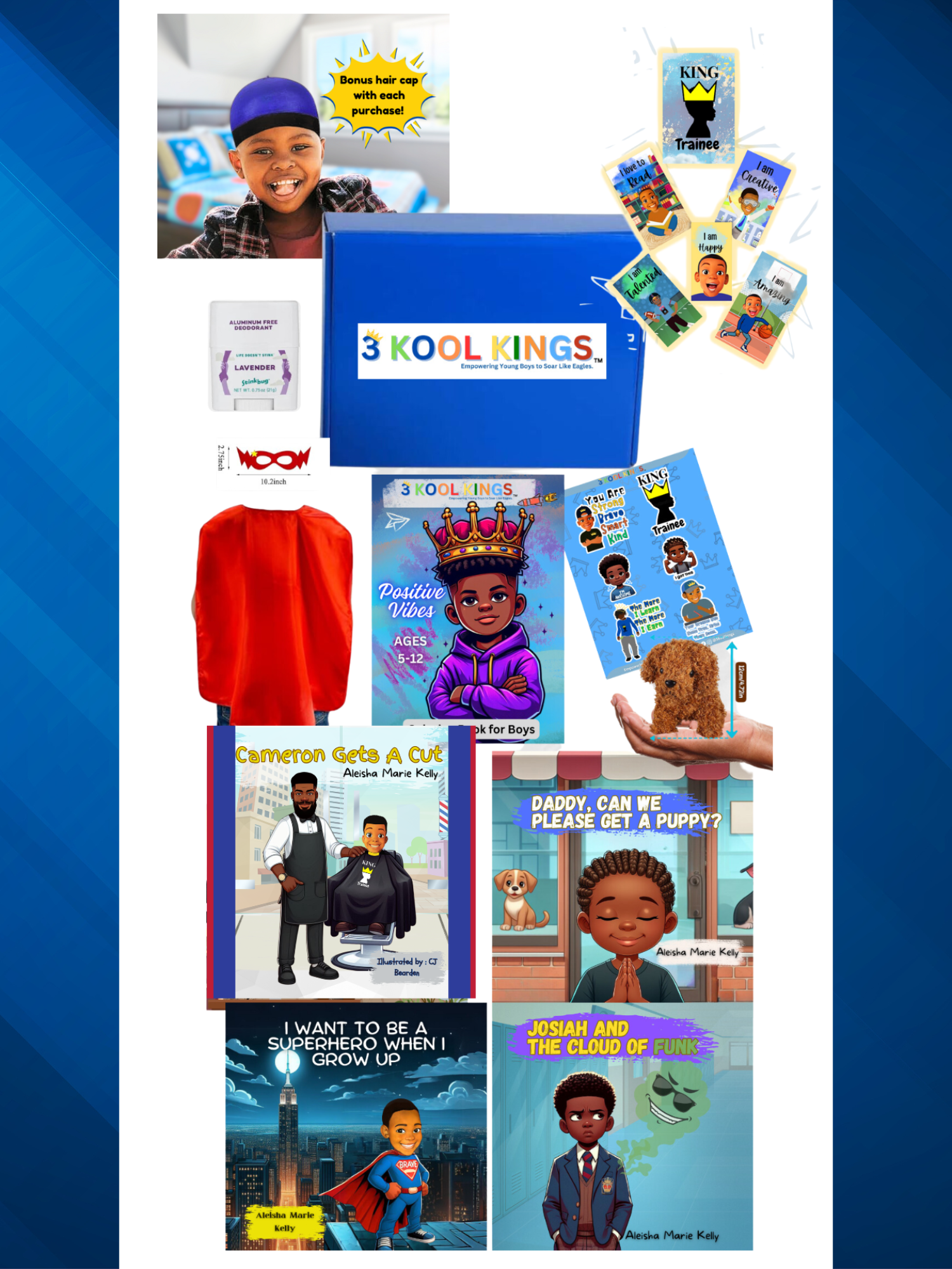 At 3 Kool Kings, we believe in inspiring young boys to dream big, be confident, and embrace their unique talents. The Boy Joy Bundle Box is specially curated to spark imagination, build self-confidence, and empower boys to see the hero within themselves.